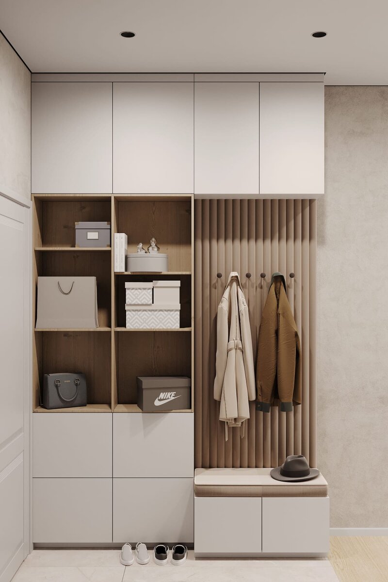 Чтобы сэкономить место, нужно максимально использовать вертикальное пространство. Повесьте крючки для одежды, установите открытые узкие полки для ключей и перчаток, а верхнюю часть стены можно задействовать под антресоли.