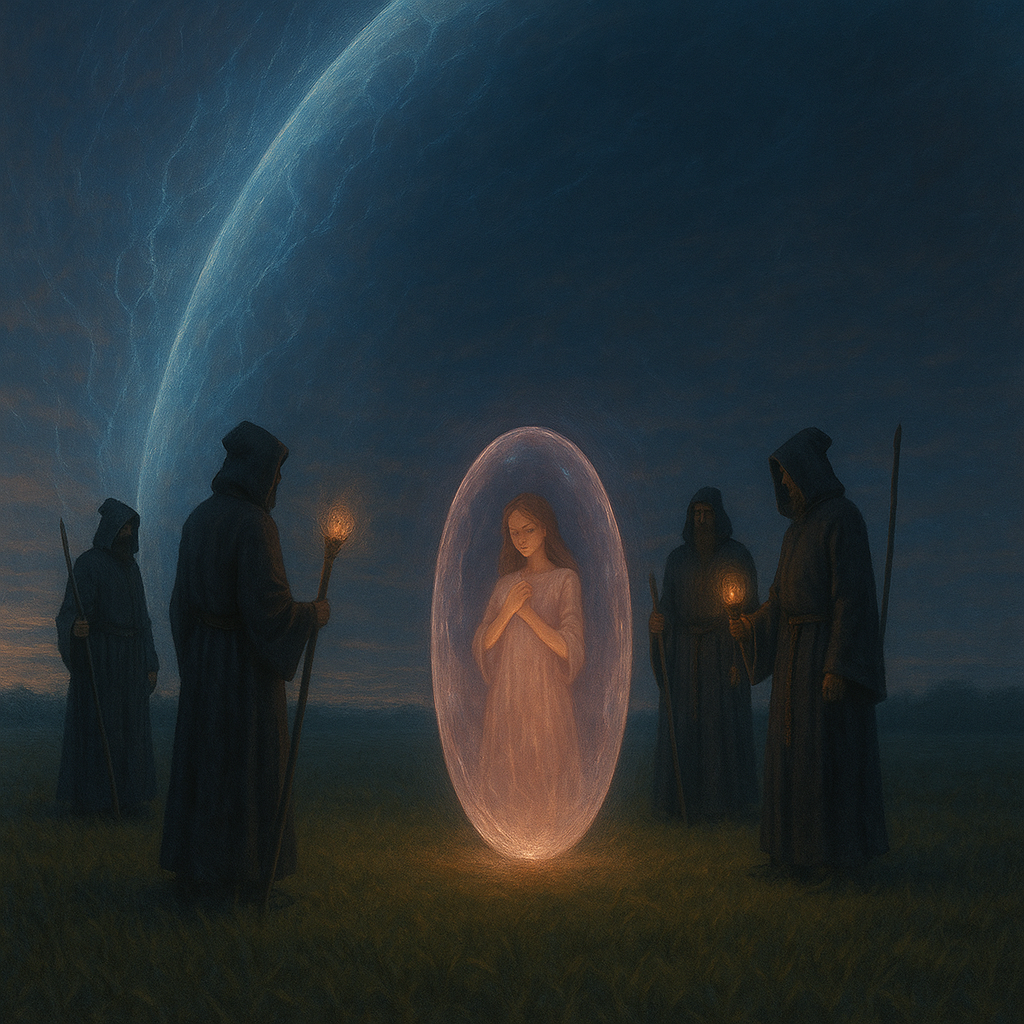 Все остальные маги по-прежнему двигались точно, бесшумно, по местам. Один из них аккуратно подстраивал фазовый резонатор, другой активировал слабое сканирование глубоких частот — не входя в поле, только по периферии. Они работали не в панике. Они работали по плану. Арден с ужасом осознал, что в их глазах сейчас нет тревоги. Только сосредоточенность. Как у исследователей. Как у медиков при вскрытии. Он повернулся чуть вбок, прищурился от пронизывающего потока света сквозь капсулу. Мириэль не двигалась. Не моргала. Не отражала ни взгляда, ни импульса. Она была теперь частью структуры. Объектом.