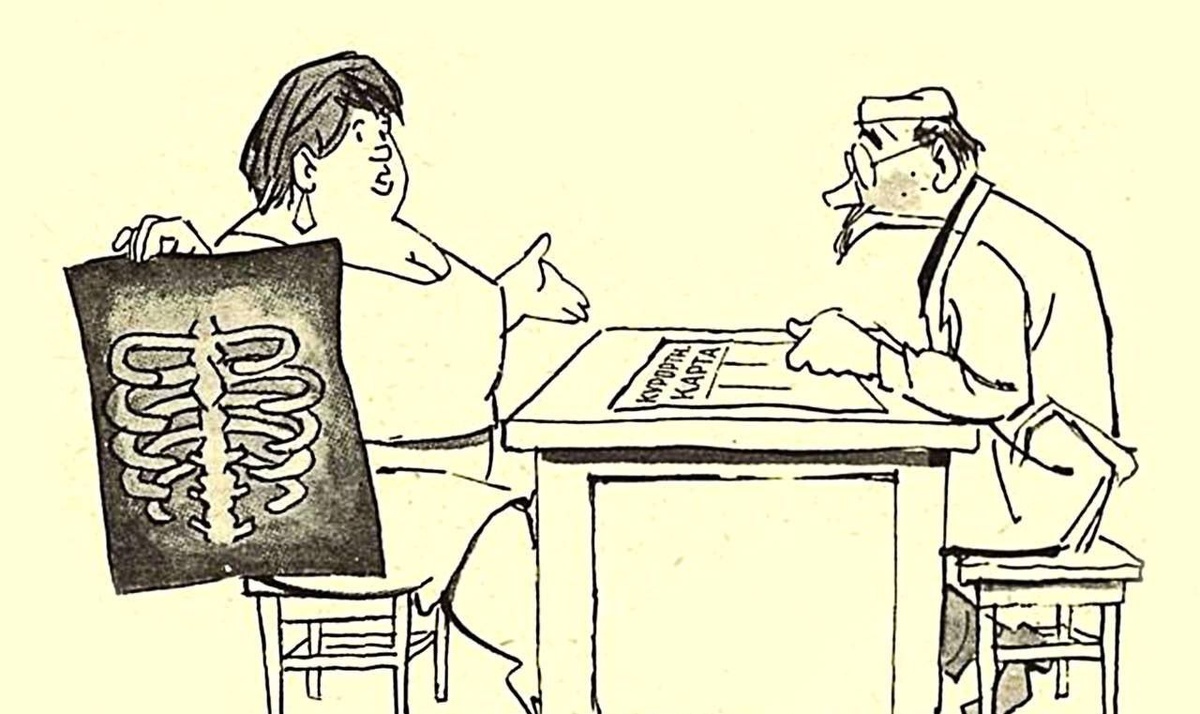Дама на приеме у врача: — Доктор, голубчик, мне срочно нужна путевка на Юг! Посмотрите мой рентген — остались одни кости! 😁 1961 г., художник Л. Самойлов Подписаться | ПРО ЮГ