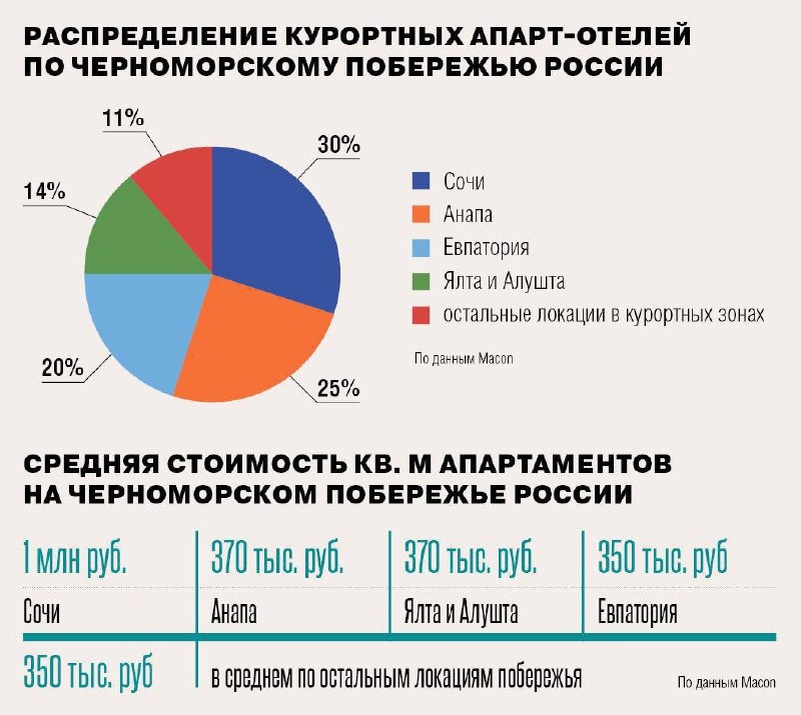 Интересная статья в Коммерсанте вышла сегодня, поделюсь с вами. В Южном федеральном округе на сегодняшний день строится 1,3 млн кв. м курортных апарт-отелей. Такие данные “Ъ-Недвижимость” озвучили в консалтинговом агентстве Macon. Из общего объема строящихся в ЮФО апарт-отелей 30% приходится на Сочи, 25% — на Анапу, 20% — на Евпаторию, 14% — на Ялту и Алушту. Остальной объем распределен между остальными курортными зонами. Стоимость квадратного метра в апартаментах варьируется от 350 тыс. руб. — в среднем по черноморскому побережью Краснодарского края и Крыма — до 1 млн руб. в Сочи и Сириусе! Отношение покупателей к апартаментам за последние пять лет заметно изменилось, считает коммерческий директор группы «Мантера» Ирина Игнатьева. По ее словам, если раньше апартаменты воспринимались как временное жилье или спорный актив, сегодня они становятся полноценной альтернативой квартирам — особенно в премиальном сегменте. «Большинство покупателей, если судить по нашим активам,— частные лица