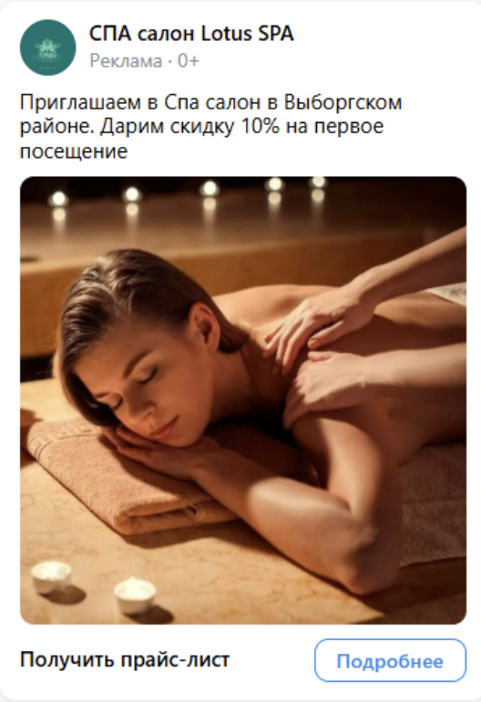 В SPA центрах очень важно иметь красиво оформленный прайс лист с популярными услугами. Людям необходимо знать продолжительность и стоимость сеанса, а в рекламном объявлении такое количество информации разместить невозможно из-за ограничения символов. Поэтому мы сделали такую воронку: