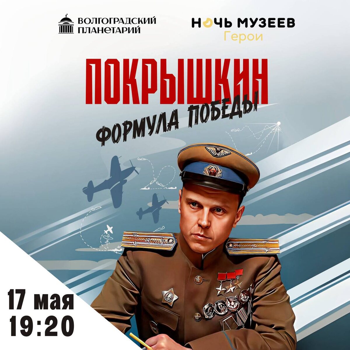 ................................................ НОЧЬ МУЗЕЕВ В ПЛАНЕТАРИИ: ПОГРУЖЕНИЕ В ПОДВИГ ГЕРОЯ #ТематическиеПрограммыВолгоградскогоПланетария ............................................... 17 мая в 19:20 в рамках акции "Ночь музеев" приглашаем вас на бесплатный показ уникального полнокупольного фильма — «Покрышкин. Формула победы». Это первая художественная картина в формате 360° о легендарном лётчике, трижды Герое Советского Союза — Александре Ивановиче Покрышкине. 🔥 Почему это нужно увидеть? ✔ Полнокупольный формат: вы окажетесь внутри кабины истребителя, почувствуете напряжение воздушных боёв и гениальность тактики "высота – скорость – манёвр – огонь". ✔ Реальные истории: от детской мечты до подвигов, изменивших ход войны. ✔ Технологии 360° + 3D: архивные кадры и спецэффекты, создающие эффект полного погружения. 📌 Количество мест ограничено! — спешите приобрести нулевые билеты! А после сеанса предлагаем обсудить программу в комментариях к этому посту! «Это не просто