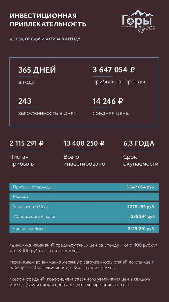 ⚡️ИНВЕСТИЦИОННАЯ ПРИВЛЕКАТЕЛЬНОСТЬ ДОХОД ОТ СДАЧИ АКТИВА В АРЕНДУ АРХЫЗ| ЖИЛОЙ комплекс Второе предложение дня . 365 ДНЕЙ в году 243 загруженность в днях 🌟 от 13 400 250 ₽ стоимость Прибыль от аренды: смотрите в расчетах 👉👉Управление квартирой в ваше отсутствие Динамика изменений среднесуточных цен за аренду - от 6 400₽.сут до 18 100₽.сут Есть над чем задуматься Выбираем , не тяните своё время @lyubovgorodilova 89673158195 Примеры расчетов Семейная: Объект: 15 133 787 ПВ: 3 041 892 Ипотека: 12 091 895 Ставка 20% Платеж: 205 397 ₽ Срок 30 лет Объект: 15 133 787 ПВ: 9 133 787 Ипотека: 6 000 000 Ставка 6% Платеж: 35 945 ₽ Срок 30 лет 💵Да, самое главное - можно заказать мебель у застройщика стоимость рассчитывается отдельно!