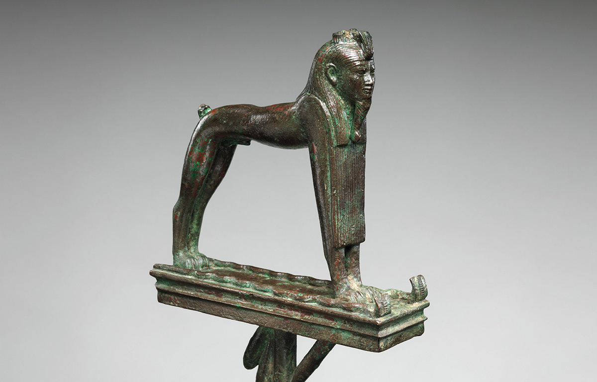 В гимнах Атону, написанных около 1400 г. до н.э., это божественно уравновешенное и бдительное животное называется "сибом" и описывается как "попирающий врагов бога солнца". Сфинкс-сиб был одной из фигур, населяющих палубы переносных святилищ в форме лодок, на которых египетские боги перевозились в процессиях. Бог, скрытый в святилище в центре лодки, или ладьи, определялся зрителями по фигурам на носу и корме. Статуэтки, окружавшие святилище, обеспечивали ритуальную защиту, а на носу стояла личная свита бога: Маат и Хатхор, дочери бога солнца Ра, которые выступали в качестве проводников, и сиб, или сфинкс, который отгонял врагов и выразительный облик которого подчеркивал потусторонний характер процессии. Сиб стоит на платформе как божественный штандарт. Кобры извиваются рядом с ним, усиливая его мощь. Сфинкс вызывает в памяти типичное египетское сочетание человека и льва, но его удлиненное тело; тонкие, высокие бедра; и отведенные назад ноги намекают на опасную грацию леопардов и п