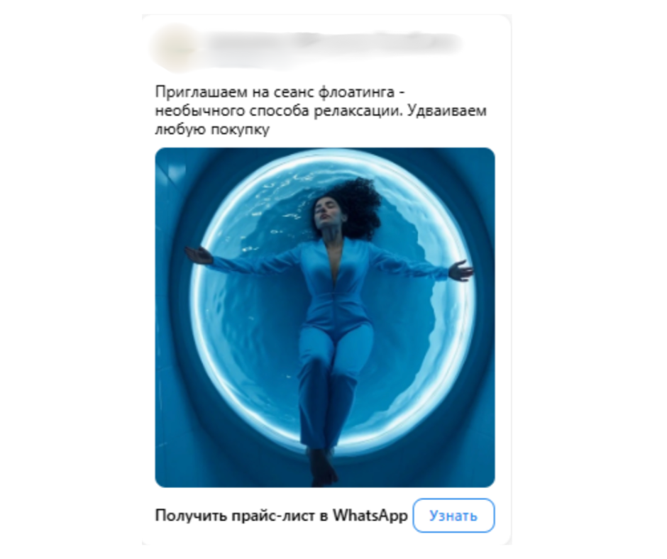 Заявки поступили быстро — уже в первый день пришло 33 заявки по 82 рубля. С клиентом договорились, что люди будут оставлять заявки под заголовком “Получить прайс-лист на WhatsApp”. В SPA-центрах важен хорошо оформленный прайс с ключевыми услугами, где указаны стоимость и продолжительность сеанса, чего невозможно вместить в одно рекламное сообщение из-за ограничений по символам. Поэтому мы создали следующую воронку: