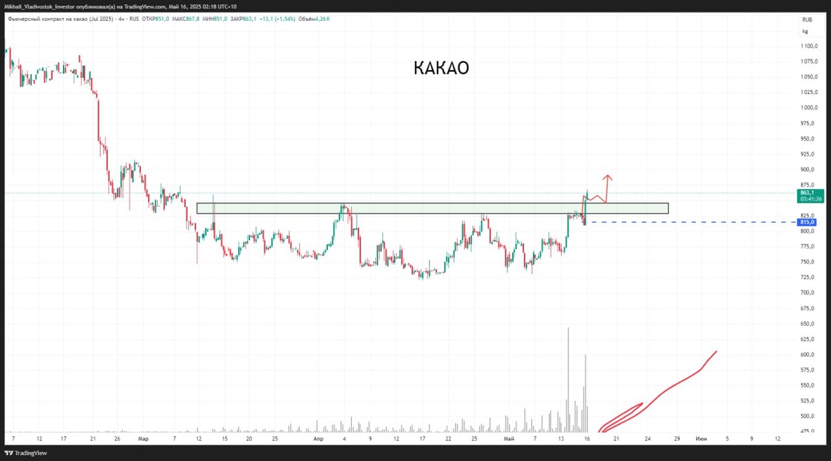 Какао тем временем пробивает очень сильное сопротивление 830-850 $CCN5 Если закрепляемся выше, то можем увидеть очень сильное движение Будем искать покупки на младшем таймфрейме.