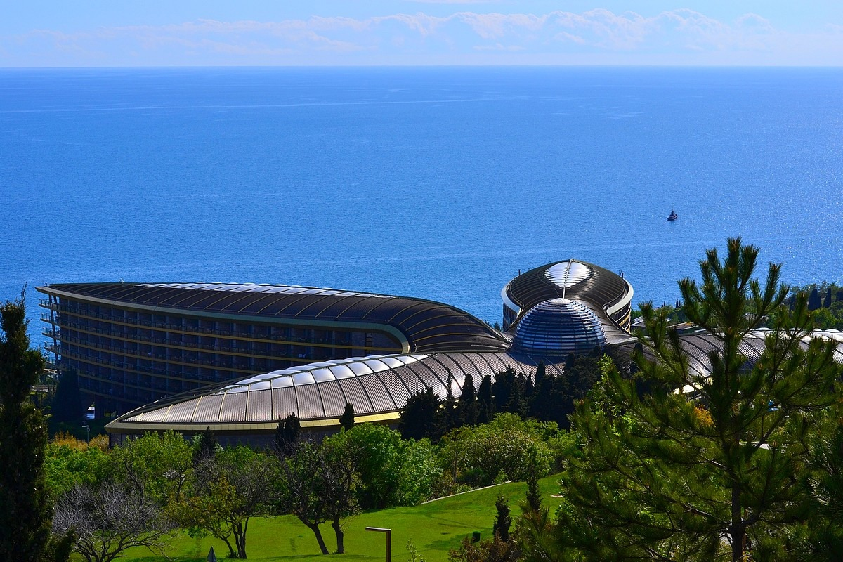 Впервые побывал внутри этого отеля. Самое интересное, что вот подобную панорамную стеклянную стену с дверьми я видел в декабре 2010 года во сне, запомнилось мне, никакой "Мрии" тогда ещё не было, сбылось спустя 15 лет, и я был в чёрном костюме с чёрной рубашкой, тоже как во сне. Интересный момент.