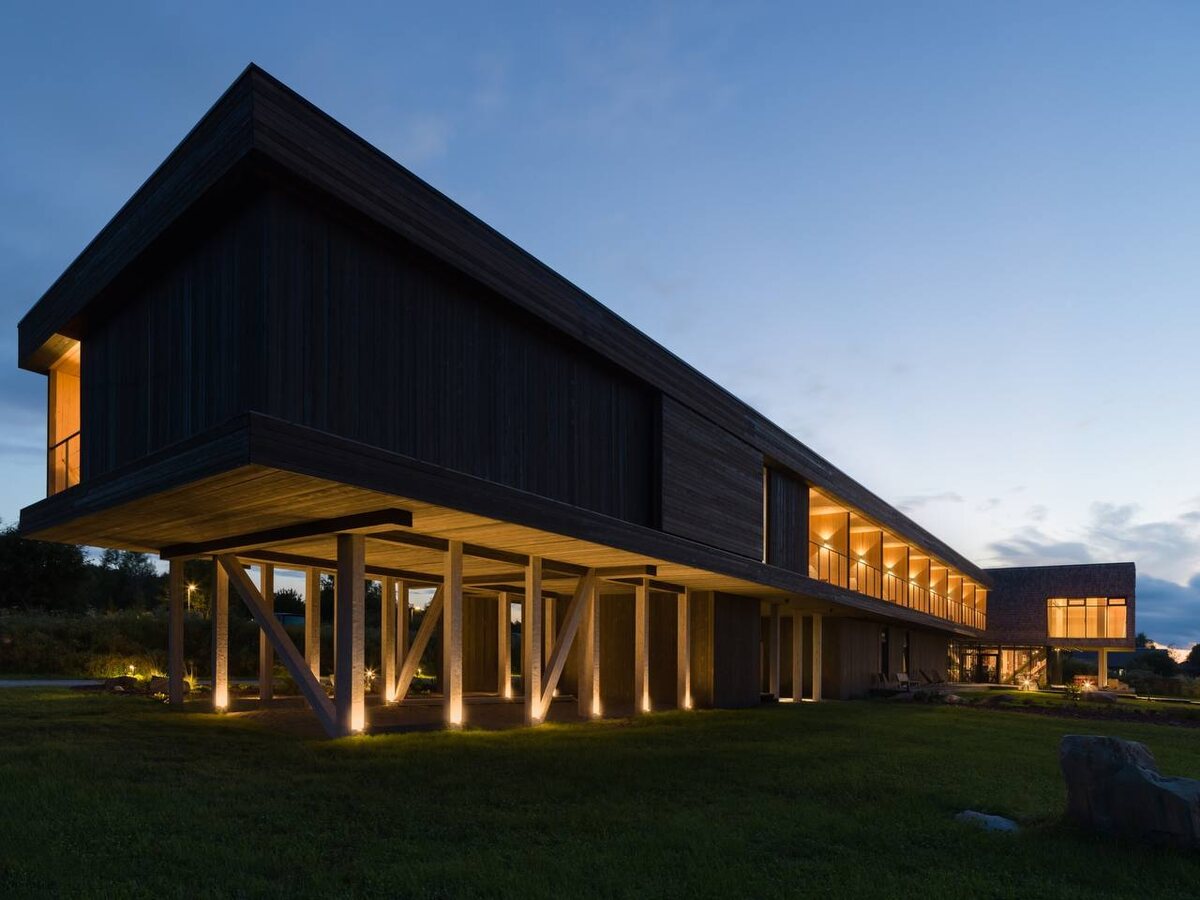 Посещение комплекса "Кижи" теперь можно совместить с осмотром современного деревянного зодчества: по проекту бюро Rhizome в карельской деревне Кажма построен бутик-отель "Заонежье". Архитекторы демонстрируют разнообразие и красоту дерева как строительного материала, используя традиционные и современные способы его обработки. Также примечательна интеграция гостиницы в ландшафт: с помощью зеленых кровель, геопластики и пышных многолетников.