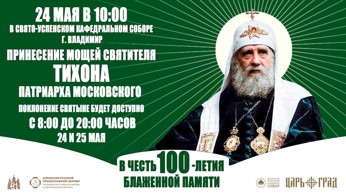 В 2025 году Русская Православная Церковь отмечает 100-летие со дня кончины святителя Тихона, Патриарха Московского и всея России. По благословению Святейшего Патриарха Московского и всея Руси Кирилла с 6 апреля 2025 года началось принесение ковчега с мощами святителя по городам Беларуси и России. 24 мая 2025 года в 10:00 ковчег с мощами торжественно прибудет во Владимир, в Свято-Успенский кафедральный собор. Организатором принесения святыни выступает Комиссия Русской Православной Церкви по развитию паломничества и принесению святынь при содействии руководства регионов России и организационной поддержке Всемирного русского народного собора. По благословению Святейшего Патриарха Московского и Всея Руси Кирилла миссия по сопровождению ковчега с мощами святителя Тихона на протяжении всего маршрута возложена на Спецсвязь. В 33-м регионе безопасность транспортировки и сохранность святыни обеспечивают сотрудники Управления Спецсвязи по Владимирской области.
