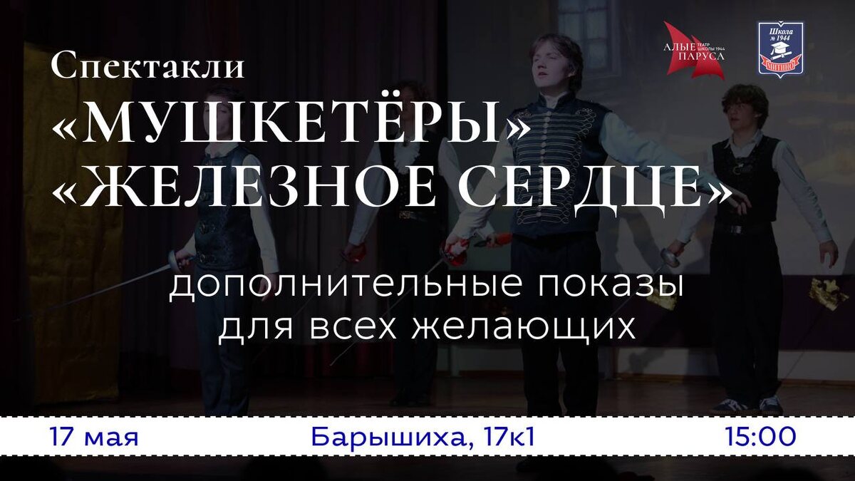 Приглашаем на показ спектаклей «Мушкетёры» и «Железное сердце» 17 мая 🎭 Школьного театра много не бывает, поэтому в эту субботу ребята из «Алых парусов» выступят сразу с двумя свежими постановками. Для тех, кто не мог увидеть их до этого, но очень хотел! ✅ Чтобы стать зрителем, нужно заранее зарегистрироваться. Стартуем в 15:00 на сцене актового зала первого корпуса. До встречи 🤝 #ДОНМ #ШколыКолледжиМосквы #ШкольныйТеатр