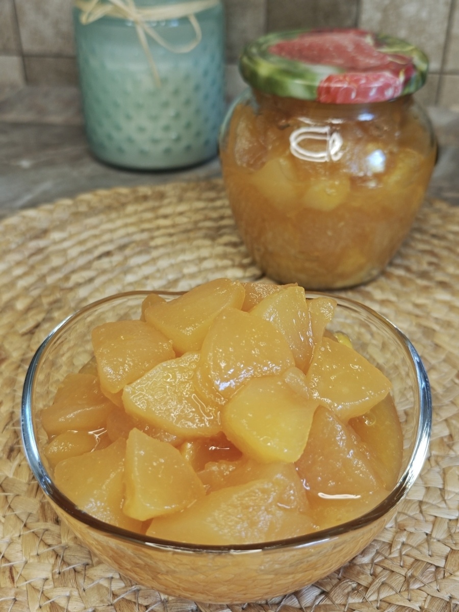 Такое варенье сохраняет форму кусочков и имеет яркий цитрусово-яблочный вкус. Отлично подходит к чаю или как начинка для выпечки.