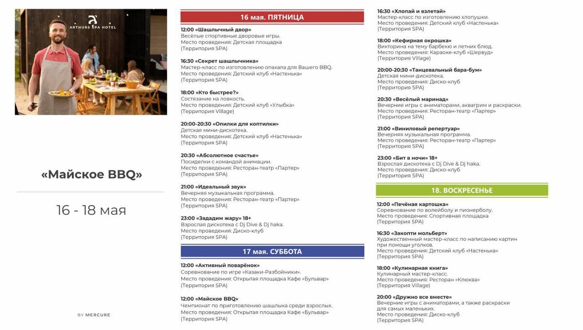 Где ещё встречать май, как не на природе, в кругу семьи, с ароматом шашлыка, весёлыми конкурсами и танцами до утра? Добро пожаловать в Arthurs Spa Hotel by Mercure, где мы приготовили для вас и ваших детей три дня вкусных впечатлений, активного отдыха и настоящего BBQ-фестиваля! 🌳🍖
