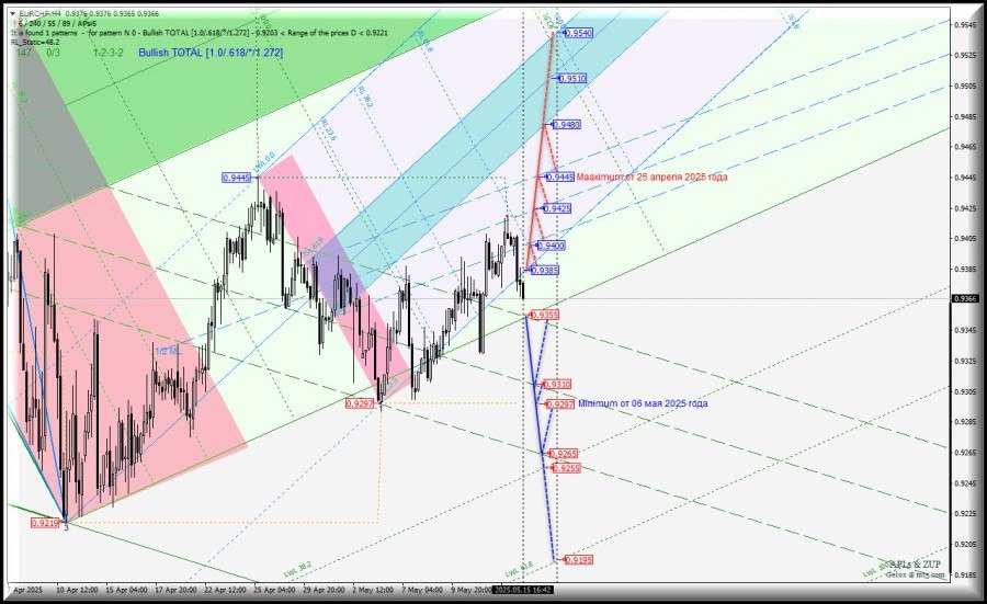 Развитие движения EUR/CHF-h4 с 16 мая 2025 года продолжится в зависимости от отработки и направления пробоя диапазона: