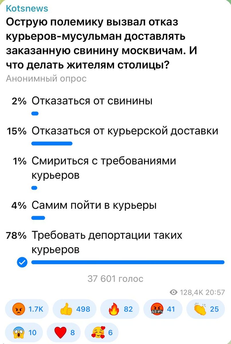 ⚡️⚡️⚡️ 78 процентов проголосовавших считают, что таких щепетильных надо депортировать. Пусть дома попробуют так повыпендриваться.