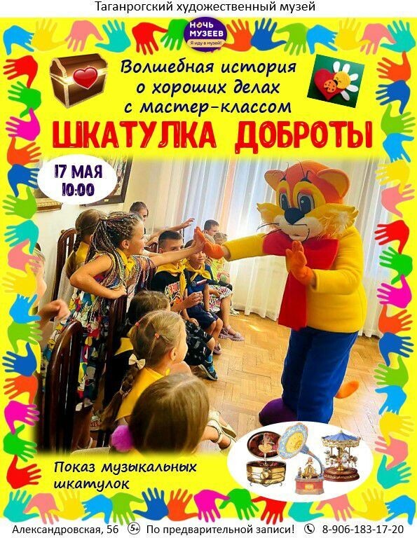 🐱"Ребята, давайте жить дружно!" - эти слова самого доброго кота в мире знают и дети, и взрослые!🌞 🐈🦋Кот Леопольд и фея Доброты приглашают детей и их родителей в художественный музей, чтобы рассказать им волшебную историю о милосердии и сердечности и открыть тайну, которую хранит "ШКАТУЛКА ДОБРОТЫ" - так называется познавательная игровая программа, которая состоится 17 МАЯ в 10:00.✨ ❤️Маленькие гости музея: -примут участие в беседе о добрых поступках; -узнают, как помогал нашему любимому городу А.П.Чехов; -увидят сценическую миниатюру по рассказу Ульяны Сергеевой "Шкатулка доброты"; -познакомятся с мини-выставкой заводных музыкальных шкатулок; -поиграют с Котом Леопольдом.🎀 🍬Девочки и мальчики получат призы из Шкатулки Доброты и сделают на память магниты в виде символов волонтерства - ладошки и сердечка.✋ 📞Вход по предварительной записи: 8-906-183-17-20. 🏛️Наш адрес: ул.Александровская, 56. #музей_детям_ТХМ #мероприятия_в_ТХМ