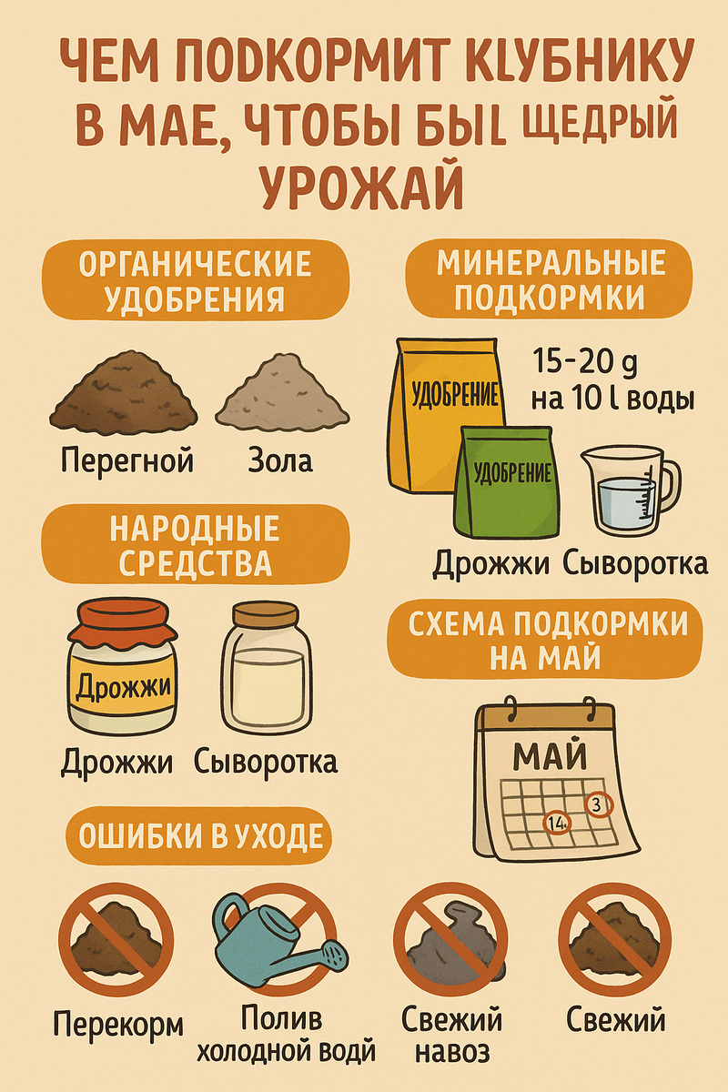 Клубника в мае — как ребёнок на росте: если сейчас правильно её подкормить, отблагодарит летом и вкусом, и урожаем. А если запустить — не жди чудес, даже самые хорошие кустики могут зачахнуть или дать мелочь, а не ягоды. Расскажу по-простому, что лучше всего даёт результат — без сложных названий, только проверенные временем и опытом средства. Все рекомендации — из личной практики и соседей по даче, кто уже не первый год выращивает клубнику ведрами. Органические удобрения: перегной, настой золы Вот с чего стоит начинать в мае. После зимы клубника ослабла, особенно если зима была непостоянная — то мороз, то оттепель. Органика — это как тёплый суп после болезни: мягко, натурально и очень полезно. Перегной Старый добрый перегной — это почти универсальная подкормка. В нём всё есть: и азот, и фосфор, и калий. Главное — не свежий навоз, а именно перепревший перегной, хотя бы двухлетний. Как применять: Если земля бедная — можно дополнительно пролить перегной настоем (заливаем во