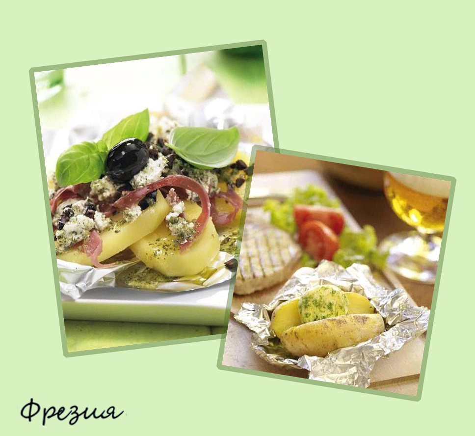 Предлагаю 2 рецепта запечённого в духовке картофеля от итальянских домохозяек. Почувствуйте вкус средиземноморья. Ингредиенты для 4 человек: - 8 средних картофелин - ветчина (нарезать соломкой) - 100 гр - свежий козий сыр (домашний, белый и мягкий) - 200 гр - черные оливки без косточек (маслины) - 190 гр - 2 столовые ложки оливкового масла - несколько веточек свежего базилика - веточка мелиссы - соль по вкусу - перец по вкусу Приготовление: Картофель очистить и нарезать ломтиками (среднее по толщине). Маслины нарезать крупными кусочками. В миске смешать козий сыр с маслинами, посолить, поперчить. Нарезать мелко мелису и базилик соединить с оливковым маслом в отдельной миске. Противень застелить фольгой, выложить картофель и сверху на картофель положить сырную смесь. На сырную смесь положить ветчину, нарезанную тонкой соломкой и полить маслом с мелиссой. Накрыть фольгой и запекать в духовке, разогретой до 200°C в течение примерно 40 минут. Подавать сразу же, как приготовится. Ингредиен