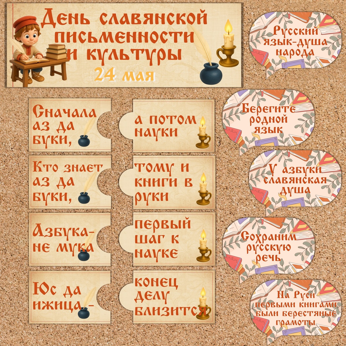 Оформление школьной доски «День славянской письменности и культуры» В набор для оформления входит: Набор можно использовать и для презентации. Подходит как украшение кабинета для тематических классных часов и внеурочных занятий. Файл в PDF-формате на листах А4. В процессе печати можно настроить необходимый размер материалов.