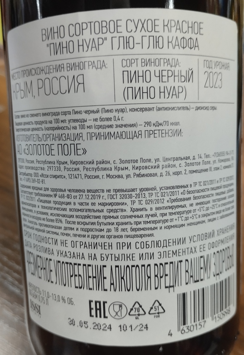 Красное сухое вино Золотое Поле, "Каффа" Глю-Глю Пино Нуар