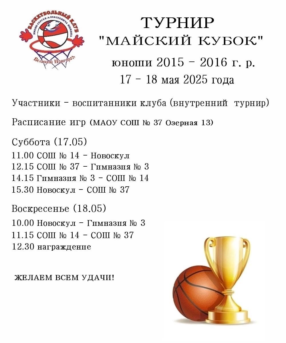 🏀 С 17 по 18 мая состоится турнир «Майский Кубок» среди юношей 2015–2016 годов рождения. Эти внутренние соревнования пройдут на базе МАОУ СОШ №37 по адресу: улица Озерная, 13. В рамках турнира, который станет финалом сезона, юные спортсмены продемонстрируют всё, чему они научились за год упорных тренировок!