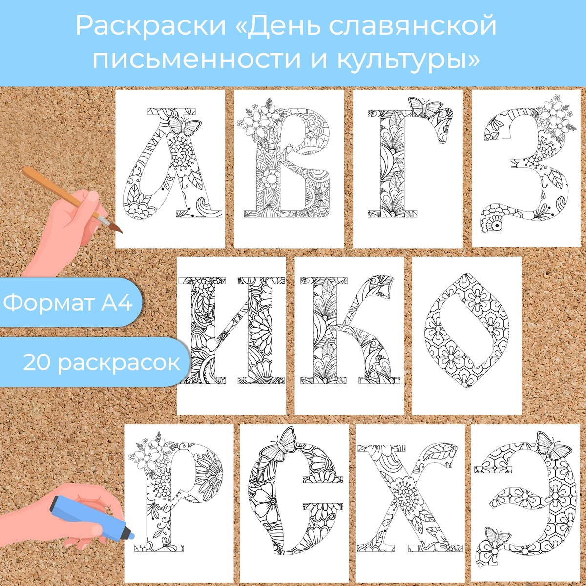 Раскраски «День славянской письменности и культуры» (24 мая) Данный материал можно использовать как дополнительный инструмент на занятиях к 24 мая. Раскраска помогает в концентрации внимания, развивает творческие способности, улучшает мелкую моторику и координацию движений. В наборе 20 раскрасок. Можно раскрасить с помощью красок, цветных карандашей или фломастеров. Файл в формате PDF на листах А4. В процессе печати можно настроить необходимый размер материалов (например, сделать раскраску на листах А5). Подходит для черно-белой печати.