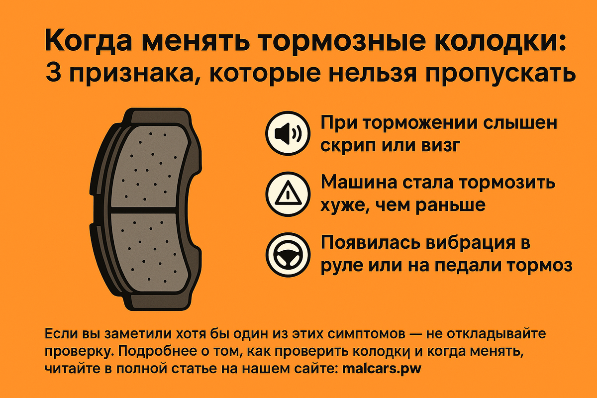 Если вы заметили хотя бы один из этих симптомов — не откладывайте проверку. Подробнее о том, как проверить колодки и когда менять, читайте в полной статье на нашем сайте: malcars.pw
