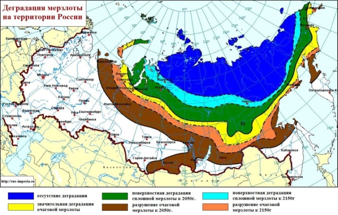 Сегодня мерзлота - очень быстро тает, то есть натуральный метангидратный холодильник работает всё менее интенсивно. В последние 10-15 лет идёт очень интенсивное смещение границы мерзлоты на север, причём как в России, так и в Канаде. В одном закрытом научном исследовании говорилось даже о 200 км смещения границы вечной мерзлоты на север в Ханты-Мансийском автономном округе. Вот официальная схема "НИИ глобальных проблем энергетики" и даже в ней говорится тоже самое: