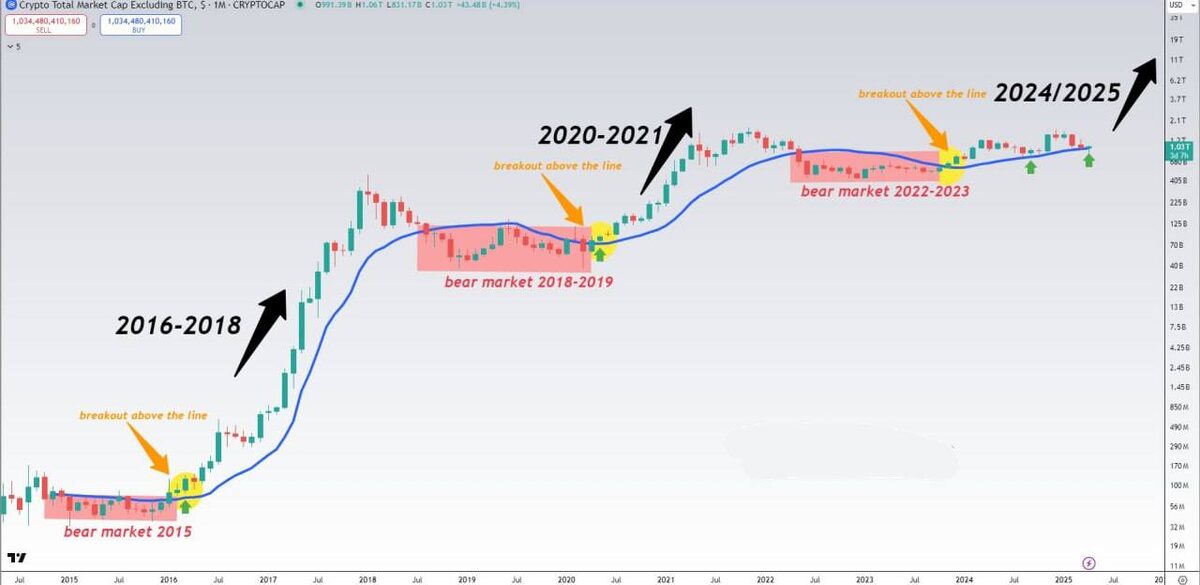 🔥 #Altcoins: The party’s just getting started! A ton of folks are asking—are altcoins still riding the bull market? The answer is a resounding YES! ✅ The TOTAL2 chart (that’s altcoin market cap minus BTC) is holding strong at the MA20 on the monthly timeframe, just like it has in every previous bull run. Buckle up, because the biggest wave of growth is still ahead! 🚀💰