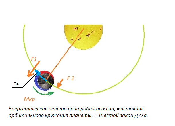 Согласно третьему закону ДУХа, = Солнце светит тому, кто провоцирует эту светимость, светит на поверхность тела планеты, = объемное расширения масс тела планеты, = скользящая дельта смещения центра масс. Скользящая по телу планеты энергетическая дельта смещения центра ее масс, в обращении относительно ее оси, = согласно Пятому закону ДУХа, за счет энергетической дельты центробежных сил, формирует орбитальное тяжение тела планеты. = Шестой закон ДУХа. Алексей Рожков.