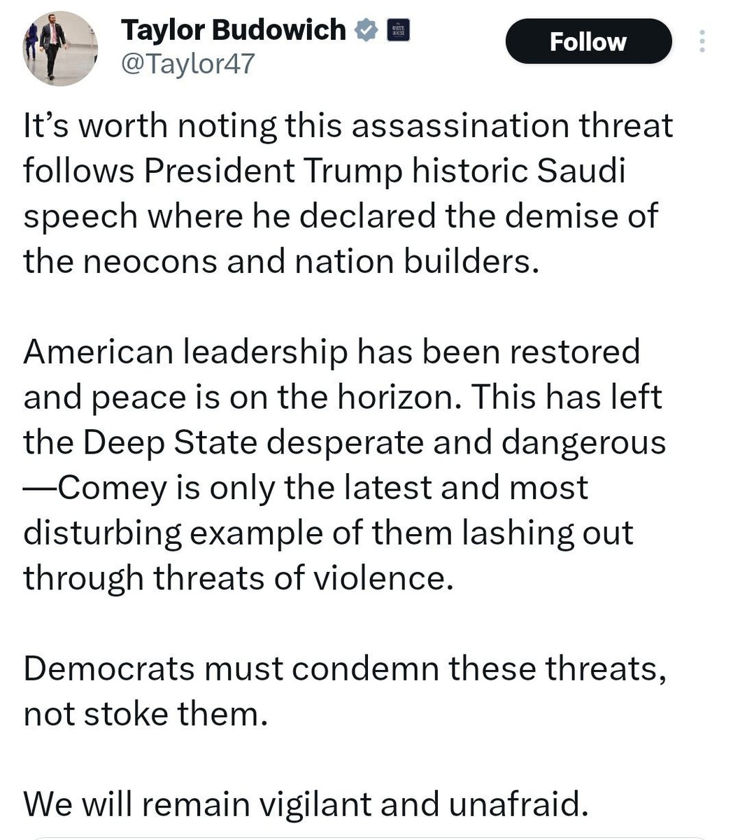 Deputy Chief of Staff says Deep State 'desperate and dangerous' and urges Democrats to CONDEMN 86 47 post.