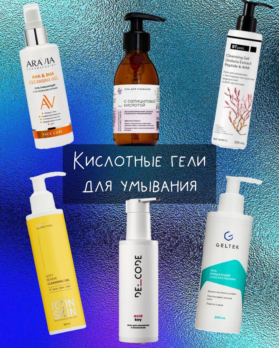 Кислотные умывашки во всей красе — от мягкого до мощного эффекта Собрала средства с разной концентрацией и по типам кожи: 1. Decode — гель с AHA-кислотами Подойдёт всем типам кожи. Шелушит, обновляет, выравнивает и даже подтягивает. Стимулирует выработку коллагена 2. Aravia — AHA + BHA Мощная формула с салициловой, молочной, гликолевой и винной кислотами. Борется с акне, чёрными точками и жирным блеском. 3. Краснополянская косметика — с салицилкой и маслом чайного дерева. Для проблемной кожи: антисептик, регуляция воспалений, очищение пор 4. Icon Skin — 6 кислот (AHA+PHA+BHA) + гиалуронка Глубокое очищение, эффект выравнивания, борьба с постакне и черными точками. Не для новичков 5. Гельтек — для чувствительной кожи, с PHA-кислотами Действует медленно и мягко, не вызывает раздражения. Идеален для тонкой, склонной к покраснению кожи 6. BTpeel — с пептидами и AHA, для зрелой кожи Экстракт бурых водорослей, витамины и кислоты: антивозрастной эффект, питание и сияние кожи Берите на з