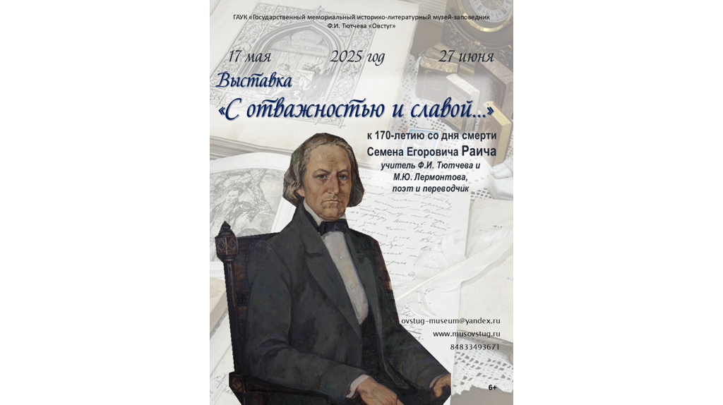 17 мая в музее-заповеднике Ф.И. Тютчева «Овстуг» пройдет открытие выставки «С отважностью и славой…», посвященной 170-летию со дня памяти Семена Егоровича Раича, поэта, переводчика, учителя Ф.И. Тютчева и М.Ю. Лермонтова. Начало в 17:00. Семен Егорович Раич – земляк Федора Тютчева. Он родился в 1792 году в Кромском уезде Орловской губернии и окончил Севскую духовную семинарию. Его старший брат Федор учился там же и стал митрополитом Киевским и Галицким Филаретом. В доме Тютчевых Раич провел шесть лет. «Это время было одной из лучших эпох моей жизни, — пишет он. — С каким удовольствием вспоминаю я о тех сладостных часах, когда, бывало, весной и летом, живя в подмосковной усадьбе Тютчевых, мы вдвоем с Федором Ивановичем выходили из дома, запасались Горацием, Вергилием или кем-нибудь из отечественных писателей и, усевшись в роще, на холмике, углублялись в чтение и утопали в чистых наслаждениях красотами гениальных произведений поэзии». Выставка откроется в мезонине главного дома-музея в р