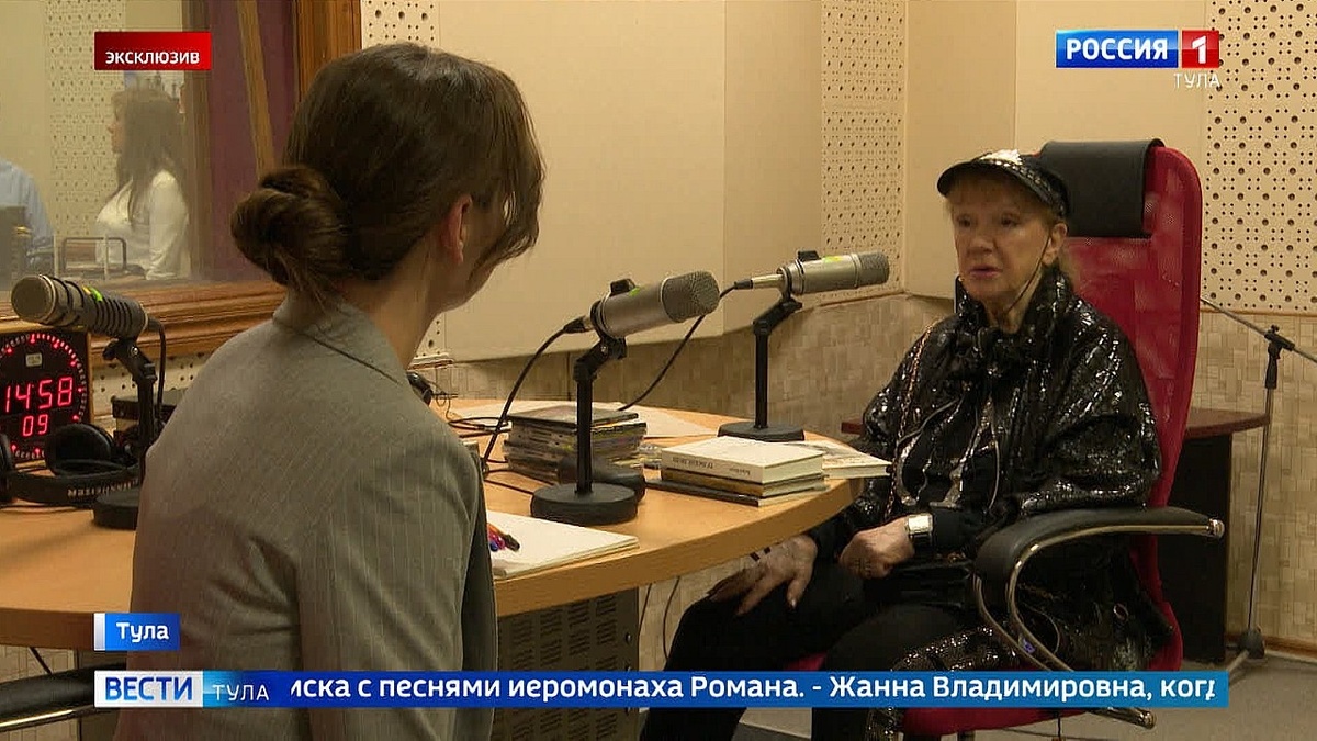 Новая пластинка народной артистки РСФСР Жанны Бичевской записана в нашем славном городе-герое. С Тулой певицу связывают нежные чувства – она замужем за туляком Геннадием Пономарёвым. В своём плотном рабочем графике прародительница русского кантри-фолка нашла время заглянуть в нашу телерадиокомпанию. Дала интервью на радио и уделила время перед телекамерой. – Жанна Владимировна, вы редкий гость в нашем городе, но очень почётный и долгожданный. По какому поводу приехали в этот раз в город оружейников? – Мы приехали с Геной записать последний диск наш. Мы уже буквально за два его записали, очень быстро мы все это делаем – два профессионала. Это будет 25-й последний диск в моей жизни. – Почти полвека на сцене. И при этом вы не изменяете своему стилю. – Правильно. Я никогда никому не изменяла – ни мужу, ни России, ни делу, которому я служу. – В вашем творчестве красной нитью проходит тема православия. Расскажите, как вы к ней повернулись, повернули своё творчество к этой теме? – Дело в том,