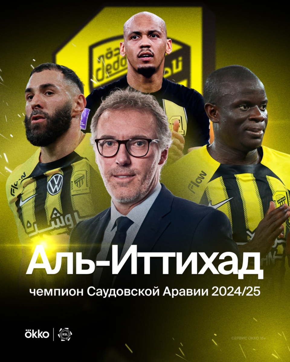 «Аль-Иттихад» — чемпион Саудовской Аравии! ⚽️ Клуб из Джидды сегодня обыграл «Аль-Раед» (3:1) и стал недосягаемым для «Аль-Хиляля», завоевав свой 10-й титул. Есть очередной трофей для Бензема, Канте и Фабиньо 💪🏻