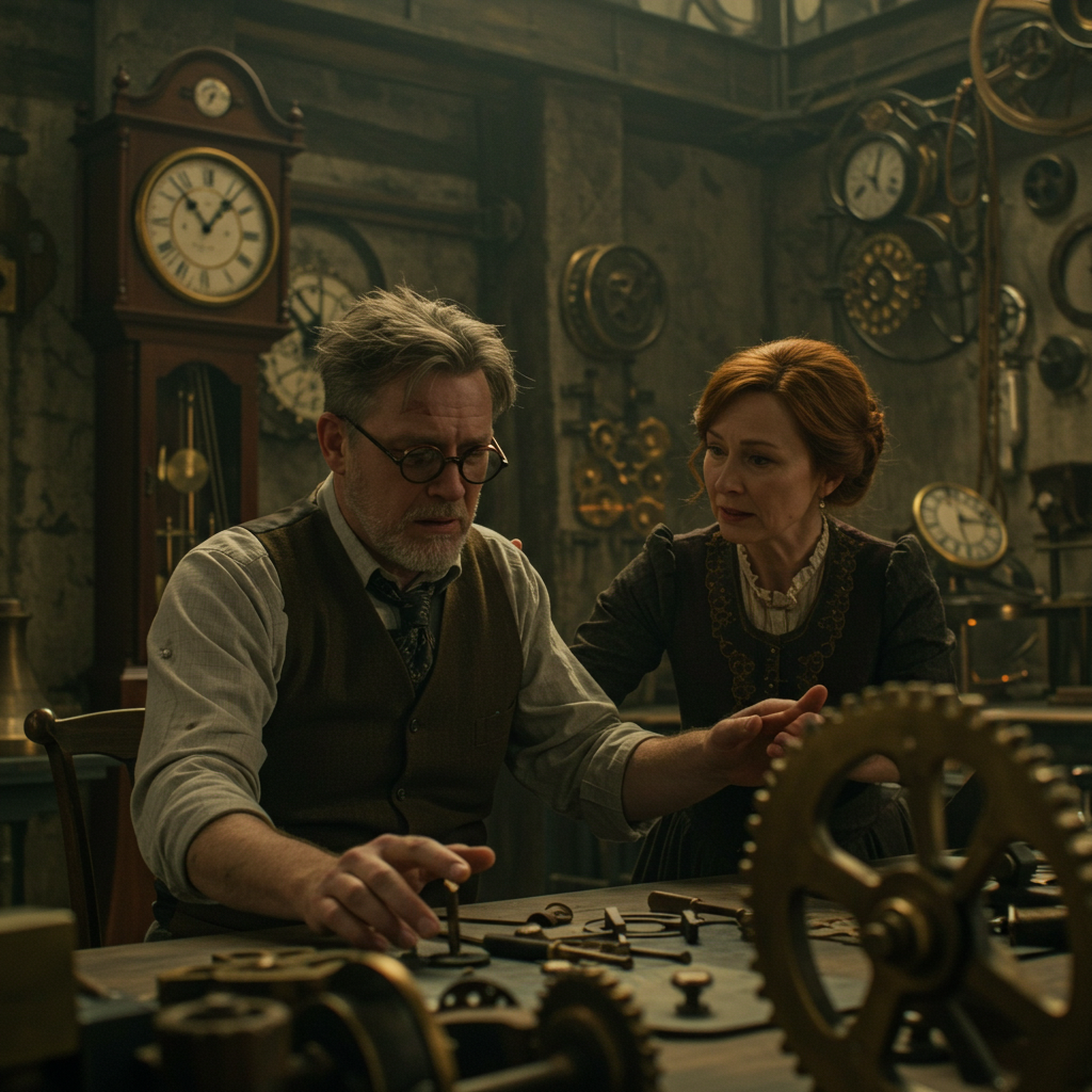 В великом городе Мезаретт, где воздух был густ от пара, а по брусчатым улицам то и дело катились механомобили, жила когда-то пара: Мастер Аргус и госпожа Амелия. Аргус был стальным великаном доброты, хранителем старинных Городских Часов. Скольким он помог за свою жизнь — и не пересчитать! Починял золотые будильники, вдохновлял молодых ремонтников, а каждый его вдох звучал, будто слаженный аккорд медной гармоники. А потом Шестерни Судьбы заскрежетали иначе. По вечерам стало слышно не его веселый посвист, а глухой скрежет усталости — будто заржавел один из внутренних механизмов. Аргус садился в своём кресле-качалке (от него разило маслом и слегка — карамелью), угрюмо разглядывал ряды гирь старинных часов и тяжело вздыхал. — Опять устал? — шептала Амелия, поправляя шляпку с медными заклёпками. Он кивал, не глядя ей в глаза — и будто ещё глубже ввинчивался в своё кресло. В городе поговаривали: "Если Мастер Аргус молчит — значит, часы идут неверно". Но Амелия знала: тут дело не в маятниках,