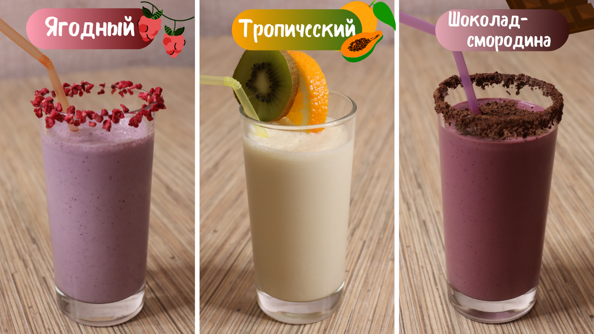 Рецепт на 2 стакана объёмом 250 - 270 мл. 1. Коктейль ягодный: 100 г ягодного пюре 200 г молока 200 г сливочного пломбира Для приготовления пюре: 100 г замороженной малины 100 г замороженной черники 2.Коктейль тропический: 100 -150 г пюре из тропических фруктов и фруктовый сок (мультифрукт, персик, манго и т.д.) 200 г молока 200 г сливочного пломбира 3. Коктейль шоколад - чёрная смородина 80 г пюре чёрной смородины (150 г замороженной смородины) 200 г молока 1-2 ст.л. какао ( по вкусу) 200 г сливочного пломбира Подробный видеорецепт смотрите у меня на канале "Дома вкуснее. Татьянa Якимова" в RUTUBE https://rutube.ru/video/c64909100883b4c3ee065c6d6a61cca2/