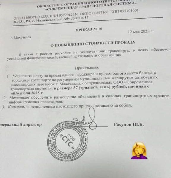 ❗️Читатели "Черновика" сообщают, что одна из транспортных компаний Махачкалы, обеспечивающих работу общественного транспорта, готовит повышение цен на проезд. С 32 рублей до 37-ми. "В целях устойчивой финансово-хозяйственной деятельности". ©37 рублей — это чтоб иногда по 20 минут ждать забитую старую маршрутку, чтоб потом на одной ноге доехать до дома", — комментируют новость читатели. Повышение цены за проезд запланировано, судя по документу, на 1 июля 2025 года. Подписаться на "Черновик" 2.0 | Обратная связь: @chernovik_1_bot