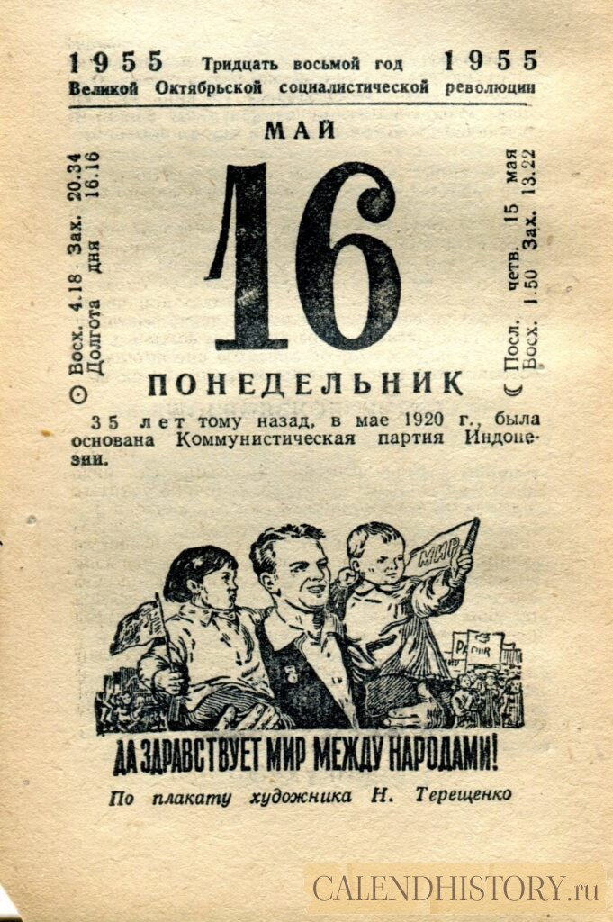 Итак, сегодня 16-го мая и у нас на календаре 1955-й год. Перед нами листок советского календаря Политиздата. На календаре у нас понедельник - 16 мая 1955-го года. ДА ЗДРАВСТВУЕТ МИР МЕЖДУ НАРОДАМИ! По плакату художника Н. Терещенко 35 лет тому назад, в мае 1920 г., была основана Коммунистическая партия Индонезии. *** Оборотную сторону листка этого календаря можно посмотреть у нас по ссылке на сайте. Другие листки советских календарей смотрите у нас на сайте - CALENDHISTORY.ru ПОСМОТРИТЕ ЕЩЁ ЛИСТКИ ОТРЫВНЫХ КАЛЕНДАРЕЙ: