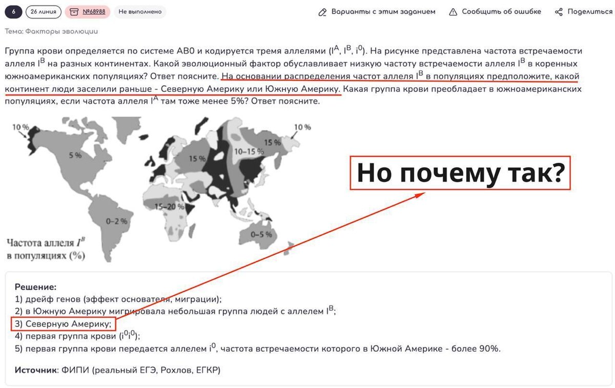 Пост 3/3 💀💀💀 А теперь следите очень внимательно! Нам известно, что в Северной Америке частота аллеля — 5%. А в Южной Америке частота — 1% (для простоты, на самом деле 0-2%, но пофиг) Теперь применяем нашу логику. Предположим ситуацию "А", что мы мигрируем из Южной Америки в Северную. У нас частота аллеля — 1%. С какой вероятностью мы передадим этот аллель в целости и сохранности (да еще и увеличим его частоту)? С вероятностью 1%. Потому что с вероятностью 1% мигрантами окажутся носители этого аллеля. Но вот случается чудо — наш 1% из Южной Америки превращается в 5% в Северной Америке! То есть мы увеличили частоту нашего аллеля аж в 5 раз. Повторюсь, что вероятность этого события была 1%! А теперь предположим другую ситуацию "Б". Мы мигрируем из Северной Америки в Южную. У нас частота аллеля в Северной — 5%. С какой вероятностью мы передадим этот аллель в целости и сохранности? С вероятностью 5%. И что мы видим? Невероятно, но... мы его действительно потеряли))))))) Теперь его в 5