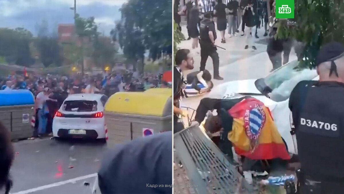 [ Смотреть видео на сайте НТВ ] Футбольные болельщики пострадали у стадиона в пригороде Барселоны, когда толпу протаранил водитель автомобиля. В Испании перед началом встречи 36-го тура чемпионата Испании по футболу между клубами «Эспаньол» и «Барселона» автомобиль протаранил толпу болельщиков у стадиона. Видео с места происшествия распространилось в соцсетях и испанских СМИ. Перед матчем произошли стычки между болельщиками команд. На видеозаписи белый автомобиль, окруженный скоплением футбольных фанатов, внезапно начинает набирать скорость, сбивая всех на своем пути. Водитель намеренно направил его на людей. Также видно, что бушующие фанаты перед этим закидывали машину мусором и другими предметами. На месте происшествия работают медики скорой помощи. По предварительным данным, пострадали не менее 13 человек. Испанские СМИ утверждают, что за рулем была женщина, она задержана. [ Смотреть видео на сайте НТВ ]