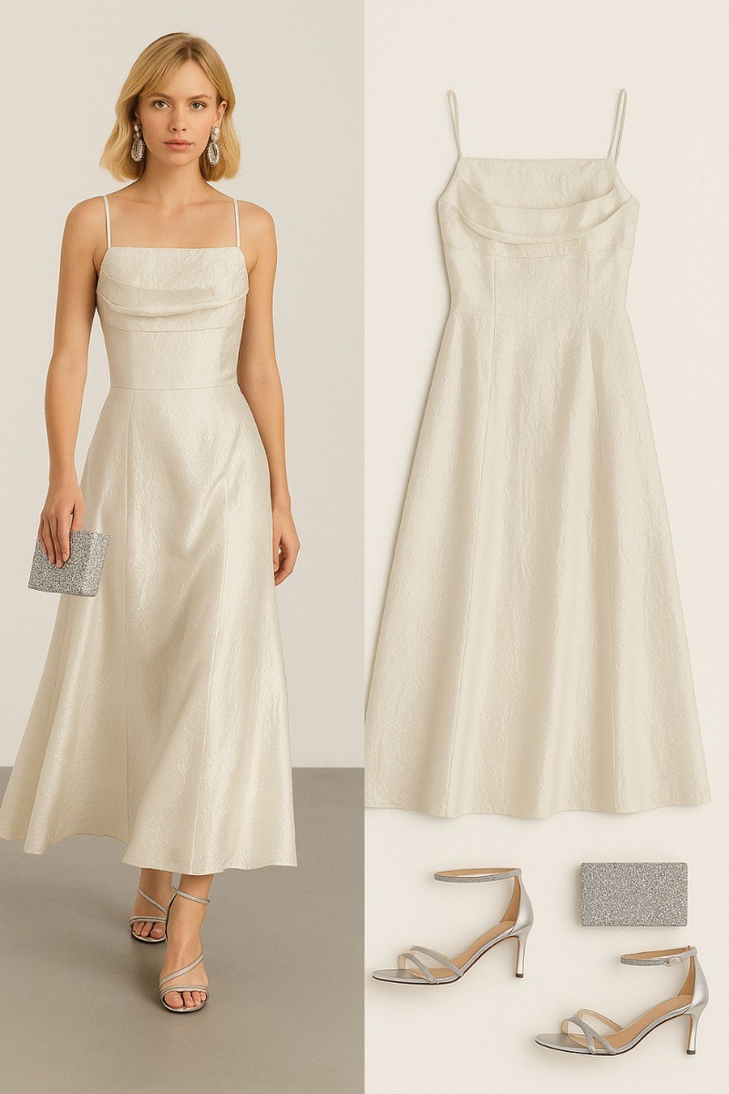 ✨Вечерний образ ✨👗💫 🔗 Ссылки на вещи: 👗 Атласное платье цвета шампанского – изысканная фактура и утончённый крой делают его идеальным выбором для особенного выхода. Лёгкий блеск ткани подчёркивает женственность и придаёт образу воздушности. 👠 Серебристые босоножки с ремешками – утончённые и лёгкие, с декором из кристаллов, добавляют нужную дозу гламура и визуально удлиняют ноги. Комфортный каблук идеально подойдёт для вечера в танцах. 👜 Клатч с серебристыми блёстками – сияющее завершение образа. Акцентный аксессуар, который соберёт на себе восхищённые взгляды и вместит всё необходимое. 💵 Стоимость образа ≈ 20 000 ₽ #вечернийлук_looksmania #вечеринкастайл_looksmania #блеск_looksmania #элегантность_looksmania