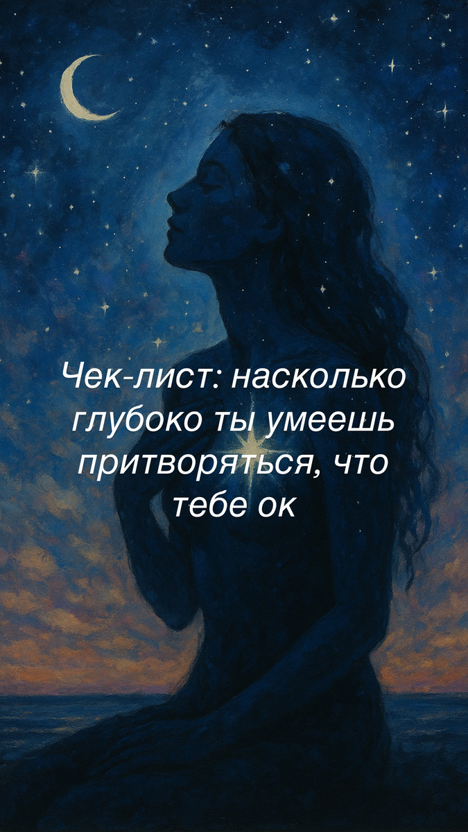Ответь на вопросы. Не мне — себе. (Хотя можешь и мне. Я не испугаюсь.) Если ты отметила больше трёх “да” — ты чемпион по “выживать красиво”. Что делать: — Начни с маленькой практики: выбирать молчание, если не хочется говорить “нормально”. Не врёшь — уже лечишь. — Поймай момент, когда ты начинаешь подстраиваться. И просто… остановись. Скажи: “я подумаю”. Этого достаточно. — Напоминай себе: ты имеешь право не быть “удобной”, “понятной”, “настроенной”. Ты — не интерфейс. Ты — человек. — Если страшно быть “не такой” — напиши мне. Я была там. Я умею слышать без анализа. И знаешь что? Ты не одна. Ты просто научилась притворяться раньше, чем научилась жить. Здесь — можно иначе. Без спектакля. Без роли. Просто ты. Оставайся.