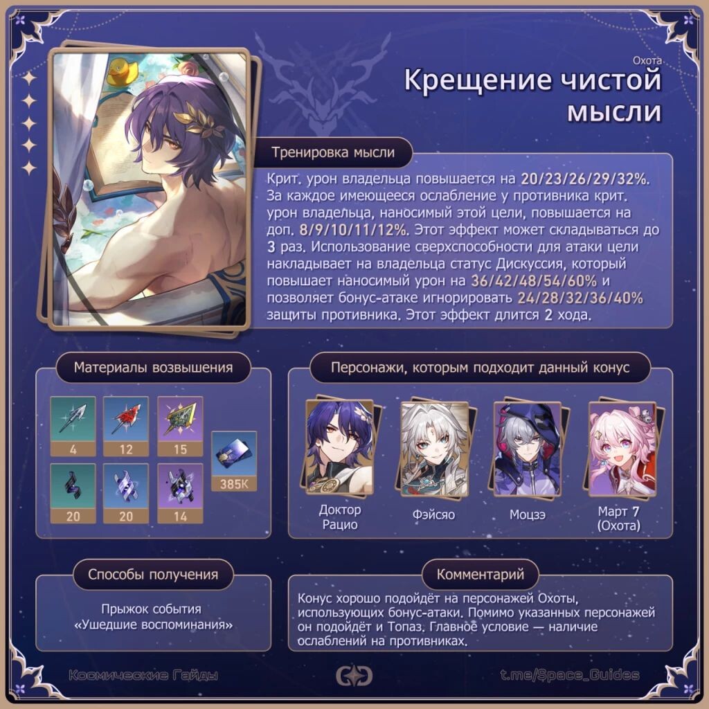 ㅤПервый реран Доктора Рацио вернул в баннер и его Световой конус — сильное решение для персонажей Пути Охоты, играющих от бонус-атак. Стоит ли его выбивать и кому ещё он подойдёт? Рассмотрим в статье. ㅤ«Крещение чистой мысли» — сигнатурный Световой конус Доктора Рацио. ㅤС подробным описанием пассивного таланта и необходимыми материалами можно ознакомиться на картинке: ㅤПовышает крит. урон владельца на 20/23/26/29/32%. За каждый дебафф на противнике, крит. урон владельца, наносимый этой цели, дополнительно увеличивается на 8/9/10/11/12%, эффект складывается до трёх раз. За использование сверхспособности для атаки, на цель накладывается статус Дискуссия, что увеличивает входящий по ней урон на 36/42/48/54/60%, а бонус-атака носителя игнорирует 24/28/32/36/40% защиты врага. Эффект длится два хода. ㅤСветовой конус «Крещение чистой мысли» будет доступен во второй половине версии 3.2. Далее конус также будет доступен для получения во время последующих реранов Доктора Рацио, о которых станет