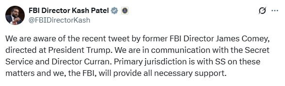 FBI Director Kash Patel gets in on the action, will help SS and DHS investigate Comey’s post