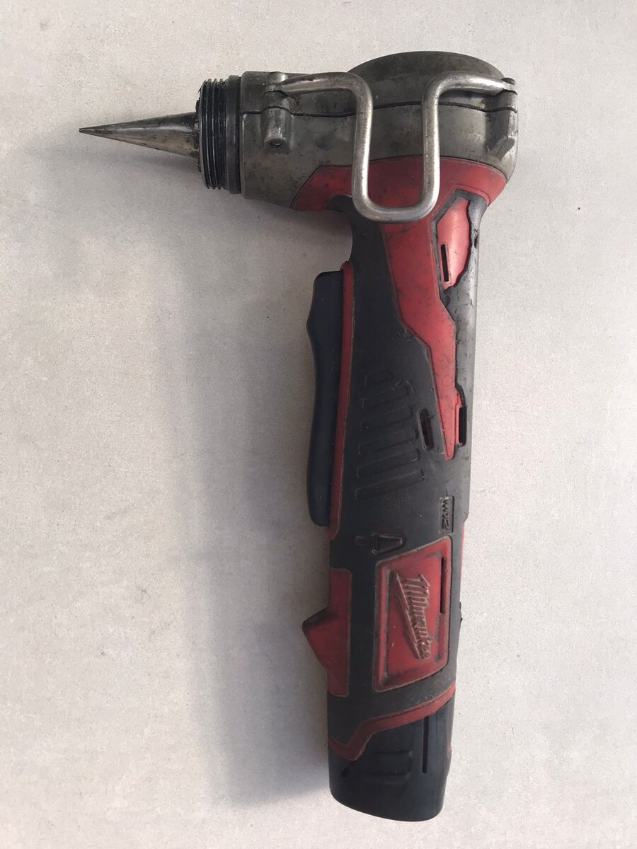 Сегодня ремонтирую труборасширитель Milwaukee C12 PXP . При включении у него загорается подсветка и показывает заряд аккумулятора. 1. Снимаем аккумулятор. 2. Снимаем скобу скрепляющую корпус, которая находится под аккумулятором. 3. Откручиваем винты корпуса битой Т15. 4.Снимаем верхнюю крышку корпуса. 5. Снимаем клавишу нажима выключателя. 6. Выталкиваем шилом два штырька крепящие двигатель к редуктору и отсоединяем редуктор. 7. Отпаиваем один провод с двигателя. 8. Подаём питание 12В напрямую с аккумулятора на двигатель - он не вращается. 9. Отпаиваем второй провод от двигателя и снимаем с него шестерню. 10. Напресовываем шестерню на новый двигатель и подпаиваем к нему провода, обращаем внимание на полярность, на плюсе на двигателе стоит красная точка, к этой клеме подпаиваем красный провод. 11. Подключаем аккумулятор и проверяем, что двигатель работает. После проверки соединяем двигатель с редуктором и стопорим двумя штифтами. Укладываем двигатель с редуктором в корпус и раскл