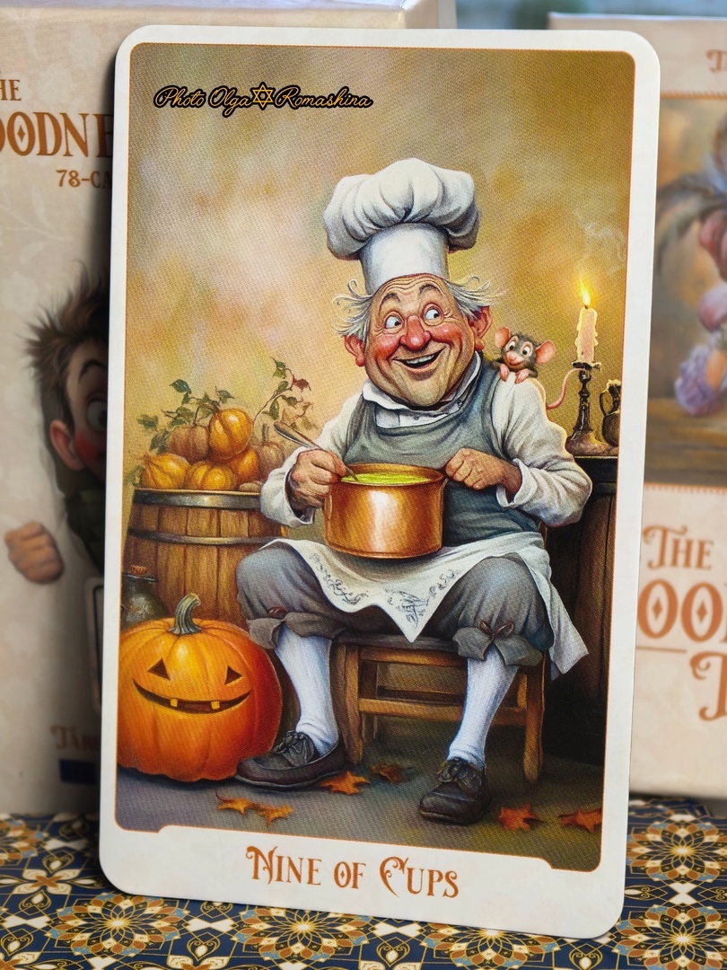 Иногда Девятку Чаш Таро называют "картой желания": она обещает исполнение желаний, гармонию и успех в делах.