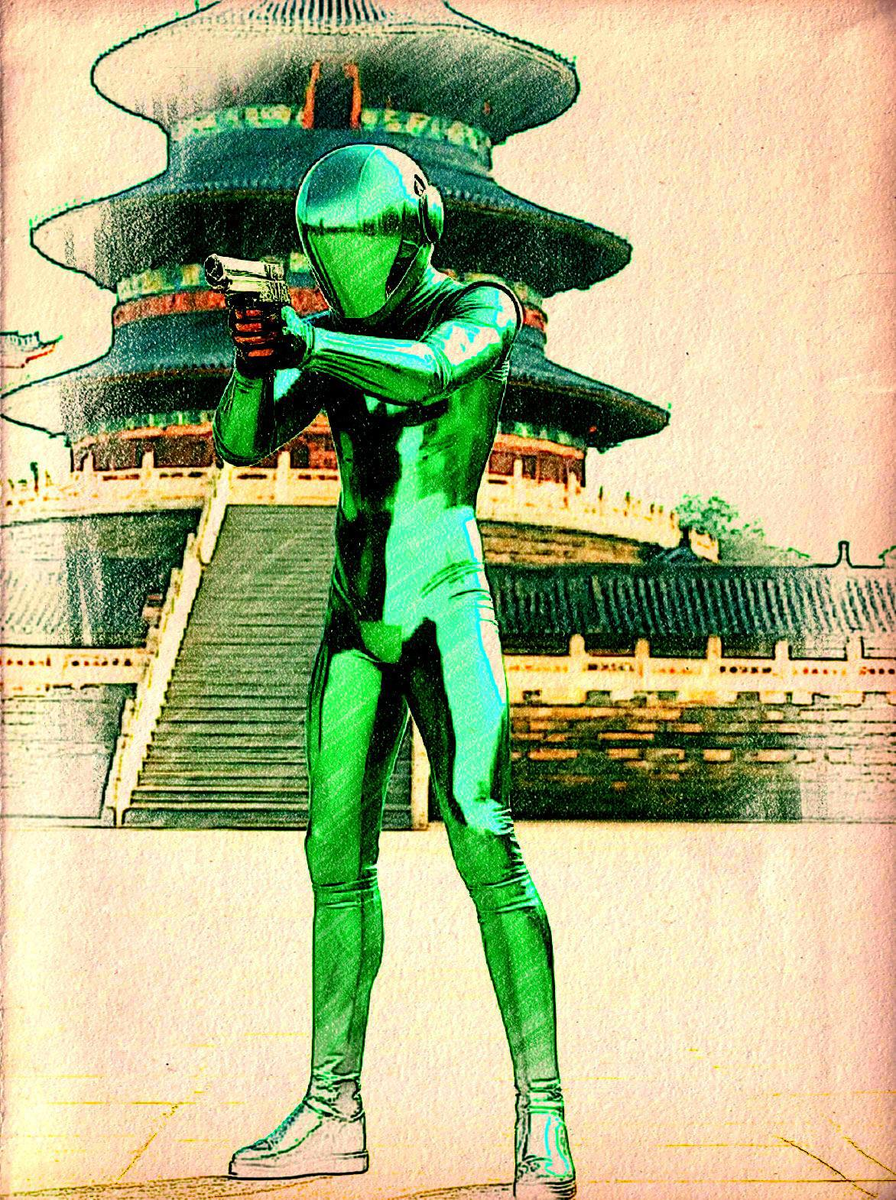 Они вылетели на площадь в тот самый момент, когда полуголый бандит воткнул кинжал в спину пленника. Толпа от неожиданности смолкла и откатилась назад. Тивиса склонилась над корчившимся пленником, осмотрела кинжал. Его лезвие из пружинистой стали напоминало елочку из-за выступающих в обе стороны длинных острых зазубрин. Такое оружие можно было вырвать только с внутренностями. Тивиса мгновенно приняла решение: успокоив раненого внушением, Тивиса нажала две точки на его шее, и жизнь мученика оборвалась. Женщина, не в силах встать на ноги, доползла до землян, умоляюще протягивая к ним руки. Полуголый вожак прыгнул к ней, но вдруг завертелся и с глухим стуком ударился головой о плиты. Тор Лик, выкинул вперёд правую руку. Подчиняясь команде, пистолет выскочил из наспинной кобуры и по направляющему тросику, идущему от плеча до кисти, прыгнул в ладонь. Движение пистолета были настолько быстрыми, что со стороны казалось, что в руке землянина внезапно ниоткуда возникло оружие. Выстрел капсулой с наркотиком из мощного пистолета 50-го калибра не просто сбило вожака с ног, но и мгновенно погрузило его в сон. Краем сознания астронавигатор подумал, что бандит наверное никогда уже и не проснётся. Но он отбросил эту мысль и бросился к женщине, чтобы поднять ее. Откуда‑то из толпы вылетел такой же тяжелый зазубренный кинжал и вонзился между лопатками женщины, убив ее наповал. Второй кинжал ударился о скафандр Тор Лика и отлетел в сторону, третий ударился о прозрачное забрало скафандра Тивисы. Метатели кинжалов явно были профессионалами в своём деле, ни один бросок не прошёл мимо цели. Гэн Атал, как всегда, рассчитывая на технику, включил защиту своего СДФ, которому он заблаговременно приказал быть рядом.