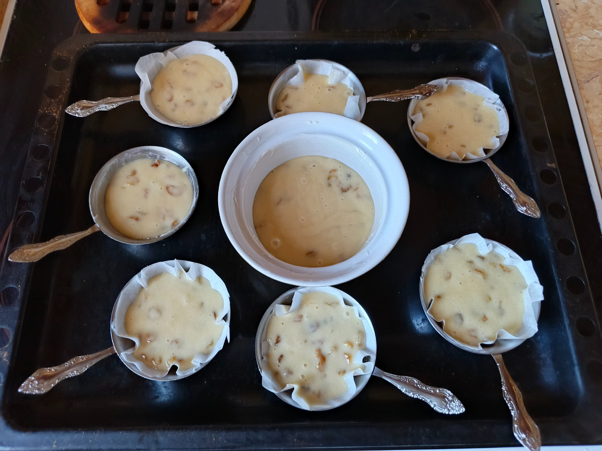Купила в пятёрочке смесь для кексов и светлый изюм - просто добавь молока и масла. Получилось месиво на 7 небольших и один средний кекс. Формочек специальных не имею, поэтому залила всё в кокотницы (такие штуки для приготовления жульенов) и одну плошку "для запекания всякого". Подложку сделала из бумаги для запекания, смазав сливочным. По-моему, вышло слишком сладко! Надо в следующий раз учинить свой рецепт - хочу кексов как из девства. Бесформенность приветствуется! PS: претендую на звание антиповара! Подписывайтесь на мой новый канал - вам всё равно, а мне денег на карту! (Но это не точно)