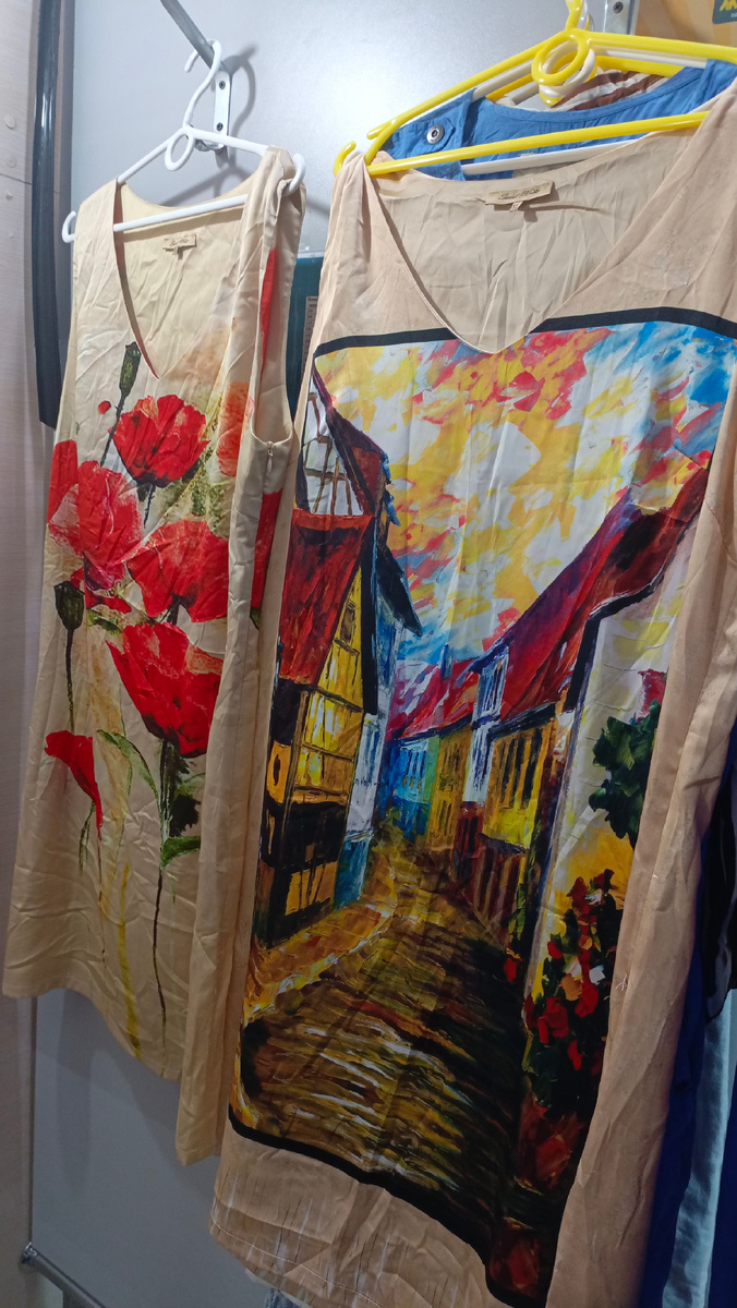Приветствую всех на своём канале! В эфире обзор из магазина "Мегахенд" в скидку дня 40%! Платьев было много интересных. Но брала только то, что приблизительно подходило мне по размеру. Да и временем располагала минимальным - находились в магазине не более часа. Платья, вероятно, от одной хозяйки. Они совершенно одинаковые. Отличаются только принтами. И я была абсолютно уверена, что они- полиэстеровые. Но, оказалось- показалось 🤔! Как видим, и передняя часть, и спинки, с идентичными рисунками. Кроме того, что бренд из Парижа, мне не удалось раздобыть какой-то ещё информации. Платья оказались вискозными. Примерить не захотелось. Стоимость у них тоже одинаковая, и со скидкой, она составила 690 рублей. Это льняное платье с ацетатной подкладкой мне очень понравилось: стройнит и вытягивает силуэт, несмотря на то, что полосы совсем не вертикальные. Но голубое от Bogner Fire+ Ice понравилось куда как больше (показывала вам его ранее), поэтому куплено было оно, а не это. Немецкий бренд по пош