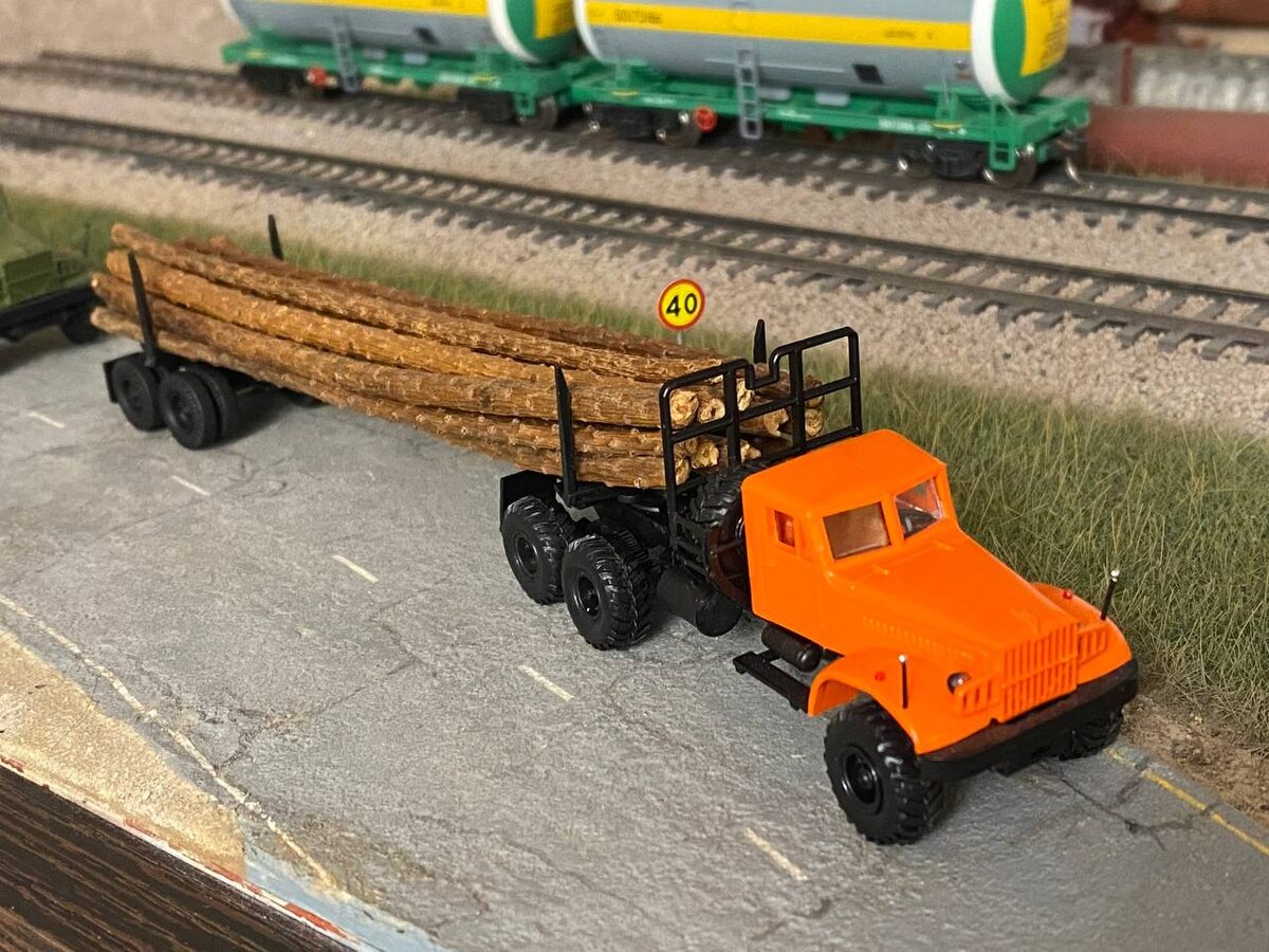 Небольшое пополнение в коллекции моделей грузовых автомобилей в масштабе 1:87. Очередной, третий по счету, КрАЗ-лесовоз занял свое место на полочке. Модель изготовлена путем конверсии серийного набора для самостоятельной сборки украинского производства. Лет пять назад такие наборы были легко доступны, продавались во многих модельных магазинах. В наши дни, впрочем, дефицита в моделях КрАЗов тоже нет. Правда китов не найти, а вот в готовом, собранном и окрашенном варианте они есть в ассортименте и в российских магазинах, и в интернет-магазинах ближнего зарубежья. Так, например, модель КрАЗа со складным роспуском продается и в оранжевом и в зеленом цвете. Зато работа с наборами позволяет создавать индивидуальные модели, делать конверсии. Так ранее была изготовлена модель КрАЗа-сортиментовоза: В этот раз был изготовлен хлыстовоз, предназначенный для перевозки не обработанных хлыстов дерева. Модель собирается достаточно просто, проблем со сборкой не было никаких. Материал - пластик, легк